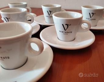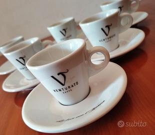 Bellissimo Servizio da caffè marcato VENTURATO composto da 12 pezzi in ceramica bianca. Il servizio è così composto: n° 6 tazzine da caffè + n° 6 piattini. Su ogni tazzina è riportato il logo della ditta mentre sui piattini è riportata l’iconico motto della ditta Venturato: “Lo bevi con l’anima”. Il servizio è stato realizzato con prodotti originali della ditta VENTURATO leader in Italia per la torrefazione e la distribuzione del caffè per Bar e Ristoranti. In ottimo stato ed usato pochissimo.