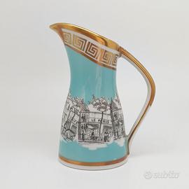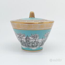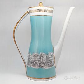 Servizio da caffè vintage in porcellana Bavaria, produzione anni ’60 circa, caratterizzato da un elegante decoro turchese con finiture in oro e illustrazione in stile parigino (“Café de Paris”). Il set è completo e composto da: •12 tazzine da caffè •12 piattini (sottotazze) •1 zuccheriera con coperchio •1 lattiera •1 caffettiera Totale: 27 pezzi. Le decorazioni dorate sono originali e ben conservate, con normali segni del tempo. Nessuna sbeccatura evidente, condizioni generali molto buone. Un servizio che unisce eleganza e carattere, perfetto sia per l’uso quotidiano sia come elemento decorativo per una tavola o un ambiente dal gusto retrò.