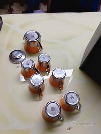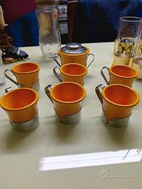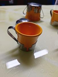 Set da caffè Vintage inoxriv degli anni 70. Un classico esempio di desain italiano. Il set si presenta in stile Space Age, con tazzine in ceramica color ocra arancio inserite in supporti di acciaio inox composto da 6 tazzine e zuccheriera con coperchio. PRODUTTORE INOXRIV (Rivadossi Francesco e figli) il set è in perfetto stato di conservazione non sbeccato prezzo trattabile