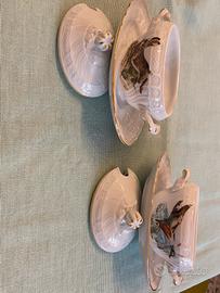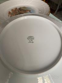 24 piatti piani ( cm 25), 2 piatti da portata ovali ( cm 40x 28,5), 2 salsiere ( cm 8.5), 2 terribe ( cm 26x 20), manifattura Richard Ginori anni 80. Reca marchio sotto la base.