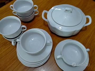 Vendo servizio da consommé da 6. Completo di tazze, piattini e zuppiera. Nuovo mai usato ma non è nella confezione originale. Preferibilmente ritiro a mano.