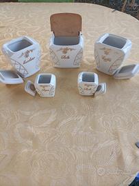 bellissimo servizio da cucina in ceramica smaltata. Composto da barattoli pepe, sale zucchero e caffè.