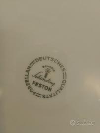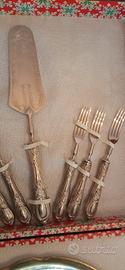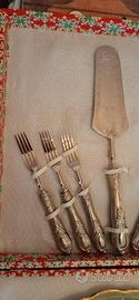 Vendo servizio completo da dolce composto da 6 forchette in argento 800/1000 più paletta con manico in argento e lama in acciaio inox più piatto in ceramica Bavaria Feston. Primi anni 70. Peso delle 6 forchette in argento circa 180 g. Mai usato., perfetto.