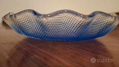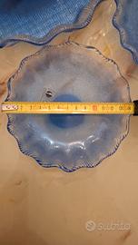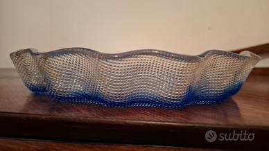 Bellissimo Servizio in cristallo sfumatura blu e lavorazione del vetro a rilievo con bordi ondulati e fondo piatto. Realizzato artigianalmente, vetro soffiato, da Cristal arti vetro/ linea Studio selezione. Il set è composto dalla ciotola da portata h. 4,5 e sei ciotoline.