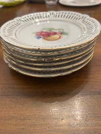 Raro raffinato servizio da dolce/dessert in porcellana tedesca Schwarzenhammer con bordo in oro smerlato e traforato