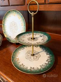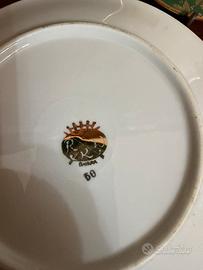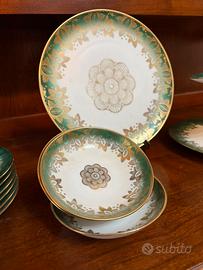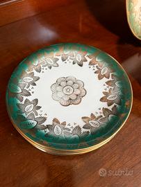 * Caratteristiche del design: Il piatto ha un motivo floreale stilizzato al centro e una fascia decorativa verde con finiture dorate lungo il bordo.