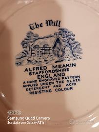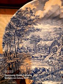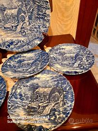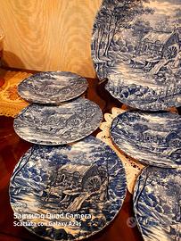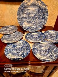 Meraviglioso Set da dolci con piatto grande e 6 piattini. Finissima Porcellana Inglese con scene Campestri nel colore azzurro. Perfetto e senza difetti.