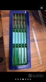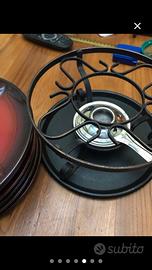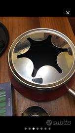 Servizio da fonduta, comprende fornellno con base in metallo, pentola, 6 piatti in ceramica e 6 forchette, usato una sola volta