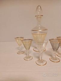 Come da foto vendesi servizio in vetro, composto da bottiglia e bicchierini. Cinque sono integri, mentre uno è, come da foto, rotto. Riparabile con la tecnica giapponese Kintsugi per valorizzare ancora di più l'oggetto. La bottiglia misura 27 cm. di altezza mentre i bicchierini 9.5 cm.