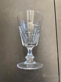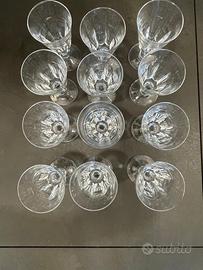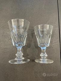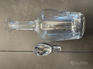 Servizio da liquore costituito da 2 brocche alte 24 cm, complete di tappo (altezza con tappo 32,5 cm), 12 bicchieri alti 11 cm, 10 bicchieri alti 9,5 cm. Cristallo. Ottimo stato.