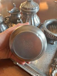 Elegante e scenografico servizio da colazione o dopocena in pregiato peltro artistico d'epoca. Il set si distingue per la raffinata lavorazione "martellata" eseguita a mano, che dona al metallo una lucentezza calda e vibrante. Lo stile è un perfetto esempio di design Art Déco, caratterizzato da forme bombate e piedi a zampa di leone o motivi floreali stilizzati.