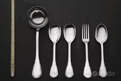 Servizio da sei posate alpacca argentato come da foto. 42 posate più mestolo, 2 posate per insalata e 2 posate per servire. (tot. 47 posate)