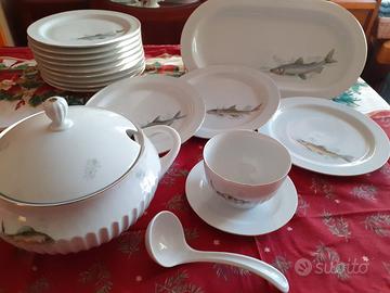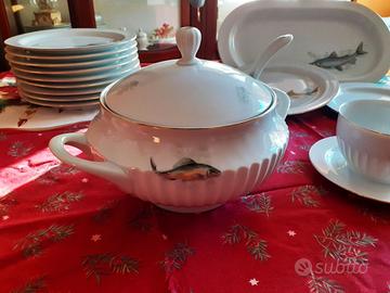 Raffinato servizio da tavola in porcellana Scherzer Bavaria, con elegante decorazione naturalistica a tema ittico.