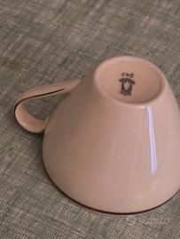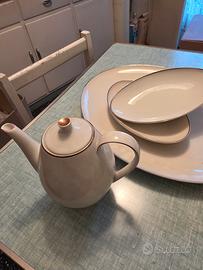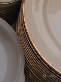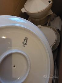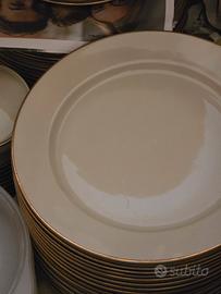 Ampio servizio da tavola prodotto dalla manifattura tedesca Schönwald. Il set è realizzato in porcellana di tonalità crema/avorio, caratterizzato da un design dalle linee pulite e moderne. Ogni pezzo è rifinito con un bordo dorato sottile e pomelli in oro sui coperchi. Composizione del set: 36 piatti piani 12 piatti fondi 12 piatti da dessert 2 zuppiere (complete di coperchio) 1 zuccheriera 1 caffettiera/teiera 2 piattini da servizio ovali 8 tazzine da caffè con piattini coordinati 1 lattiera 1 piatto fondo da portata Stato di conservazione: L'insieme si presenta in ottime condizioni generali. La porcellana è integra e non mostra sbeccature evidenti. Il profilo dorato è ben conservato su tutti i pezzi. Si tratta di un servizio robusto, tipico della produzione professionale tedesca, adatto a tavole numerose o per occasioni formali.