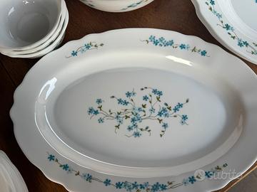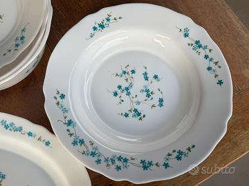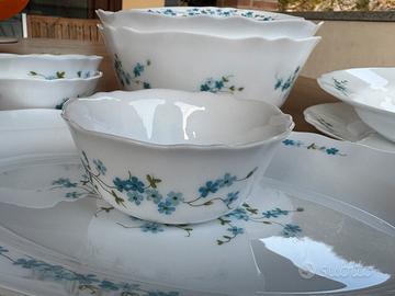 Servizio “ non ti scordar di me “ in Arcopal composto da 12 piatti piani, 11 piattini da frutta, 2 insalatiere, 3 piatti da portata, 3 ciotole da macedonia, 1 piatto fondo. Associato al servizio, un portauovo in Arcopal di tipo diverso. Disponibili 6 cucchiai e 6 coltelli azzurri, come da foto.