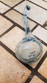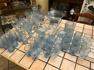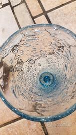 Servizio da Tavola in Vetro Artistico "Pulegoso" - Blu Acqua Marina Splendido e numeroso set coordinato in vetro soffiato artigianale, caratterizzato dalla tipica lavorazione "pulegosa" (costellata da innumerevoli bollicine d'aria all'interno del vetro) che dona una texture materica e una lucentezza unica. La colorazione presenta affascinanti sfumature naturali, tipiche della lavorazione a mano, che variano da un blu azzurro trasparente a un acquamarina più intenso, rendendo ogni pezzo unico. Composizione del Set: Pezzi da Servizio: 1 Grande Bowl (Ciotola da Punch/Sangria): Ampia e profonda, perfetta come centrotavola. 1 Mestolo coordinato: Interamente in vetro blu. 2 Caraffe/Brocche: Linea elegante con base a piede. 1 Secchiello per il ghiaccio: Con caratteristici manici applicati a caldo. Calici e Bicchieri: 14 Calici: Per vino o aperitivi, con stelo slanciato e coppa affusolata. 12 Bicchieri Bassi: Forma panciuta per acqua o vino rosso. 12 Bicchieri Highball (Tumbler alti): Ideali per bibite o long drink. 8 Coppette: Ideali per macedonia, gelato o dessert. Set di completamento: Il servizio include ulteriori bicchieri di diverse dimensioni per liquori o degustazioni. Caratteristiche di Pregio: Stile: Vintage/Artigianale (richiama la tradizione delle fornaci artistiche). Condizioni: Ottime, vetro lucido e ben conservato. Particolarità: La lavorazione a bollicine e le variazioni di tono del blu garantiscono l'autenticità del prodotto fatto a mano.