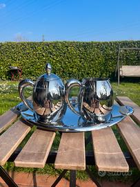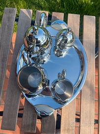 servizio da tè/caffè in acciaio inox lucido della marca MORI Italian Factory, completo di vassoio, teiera, lattiera, zuccheriera e tazze.
