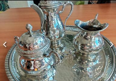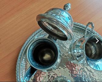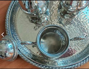 Bellissimo servizio da tè/caffè in Peltro 95% di alta qualità, vintage italiano. Composizione del set: Vassoio ovale grande con bordo decorato a cordoncino Teiera / Caffettiera Zuccheriera con coperchio Lattiera / Cremiera Caratteristiche: Finitura martellata molto elegante e luminosa Manici e dettagli lavorati con cura Perfetto stato estetico: lucido, senza ammaccature importanti né graffi evidenti Tipico stile anni ’60-’70, molto decorativo e ancora perfettamente utilizzabile Ideale per arredamento rustico, shabby chic o per chi ama gli oggetti vintage di qualità. Può essere usato anche tutti i giorni, il peltro 95% è resistente e facile da pulire.