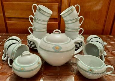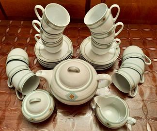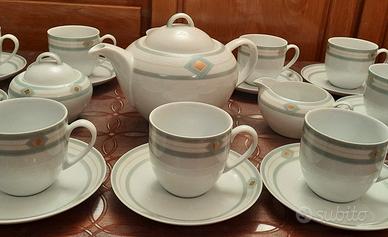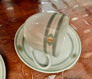 Vendo servizio da tè/cioccolata Pierre Cardin “Inca” in porcellana con decorazioni grigio, verde, bianco e oro composto da: 12 tazze (diametro cm 8 – H. cm 7), 12 piattini (diametro cm 15 - H. cm 2), 1 teiera (diametro cm 16 – H. 11,5) 1 zuccheriera 1 lattiera Tutto nuovo, mai usato