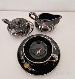 Servizio da tè in ceramica Deruta degli anni 50: lustro nero, fiori variopinti e decori argento, composto da 6 tazze con piattini, zuccheriera, bricco latte