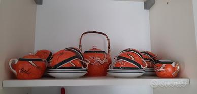Servizio in porcellana cinese, stile giapponese, completo da te per 12, tazze con piattino, teiera, zuccherina e lattiera. Originale porcellana con marchio messo in evidenza nella foto