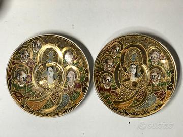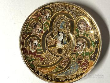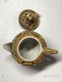 Export Moriage Dragonware - Servizio da tè (6) - Satsuma/Kutani-inspired - Porcellana con smalto crackle bianco all'interno, decorazione Moriage (rilievo dorato) su fondo - Servizio da tè giapponese 1930-1960 - Giappone - Vintage Servizio da tè giapponese Dragonware in porcellana, decorazione Moriage – 6 pezzi – metà XX secolo (1930-1960). Lotto composto da: 2 teiere con coperchio (una grande, una piccola) 1 zuccheriera con coperchio 1 tazza 2 piattini Decorazione su fondo nero con oro rialzato Moriage e medaglioni con figure tradizionali giapponesi. Teiere e coperchi con draghi tridimensionali applicati. Interni bianchi crackle. Marchio giapponese rosso sul fondo. Condizioni: Buone, coerenti con l’età. Dorature brillanti, normale usura, nessun danno strutturale (vedi foto). Dimensioni approssimative: Teiere: h. 15-19 cm Tazza: ø 9 cm Piattini: ø 14 cm Peso totale: circa 1,88 kg Imballo protettivo con tracking.