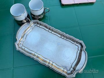 Servizio da te con vassoio ricamato e due tazzine in argentone silver plated