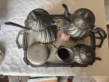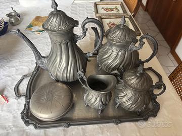 Servizio da tè 5 pezzi in PELTRO BATTUTO A MANO, vassoio completo di due teiere/caffettiere zuccheriera e bricco del latte.