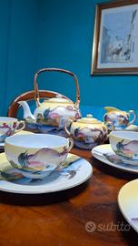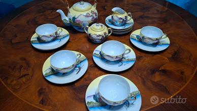 Vendo splendido servizio da tè vintage originale giapponese, realizzato in finissima porcellana "guscio d'uovo" (estremamente leggera e traslucida). Il set è finemente decorato a mano con motivi paesaggistici tradizionali (ponte, ciliegi in fiore e monte Fuji) su tonalità giallo e azzurro pastello. Caratteristica speciale: Sul fondo di ogni tazzina è presente una litofania (una filigrana nella porcellana) che mostra il volto di una Geisha quando la tazza viene tenuta controluce. Il set comprende: 1 Teiera con manico in midollino/bambù 1 Zuccheriera con coperchio 1 Lattiera 5 Tazzine con relativi piattini Stato: Ottime condizioni vintage, senza crepe o sbeccature evidenti. Ideale per collezionisti o per amanti dello stile Shabby Chic e Orientale. Disponibile per ritiro a mano a Cagliari.