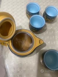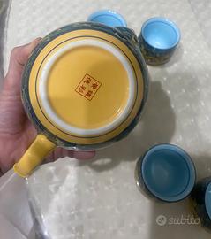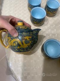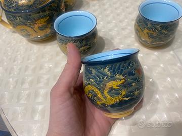 Vendo elegante servizio da tè in porcellana di stile cinese, composto da teiera con coperchio e 6 tazze coordinate. Il set è decorato con motivi tradizionali raffiguranti draghi e onde, simboli di fortuna e prosperità nella cultura orientale. Colori intensi blu, oro e azzurro interno delle tazze. MAI UTILIZZATO.
