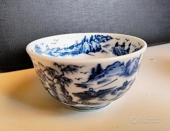 Tazzine: Sei tazzine coordinate con la teiera, anch'esse decorate con motivi paesaggistici in blu e bianco.