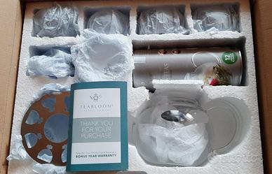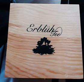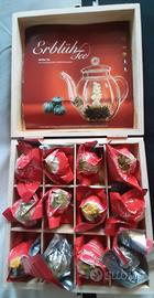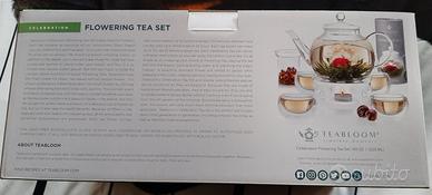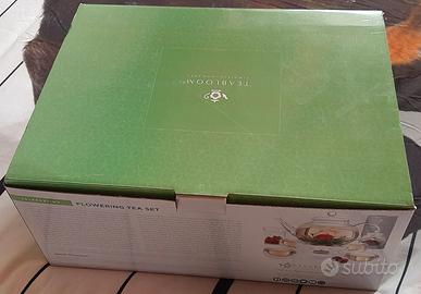 IN SCATOLA ORIGINALE MAI USATO con TUTTI GLI ACCESSORI IN VETRO - teiera in vetro borosilicato, 12 fiori di tè verde, riscalda teiera, 4 tazze a doppio strato, infusore per tè sfuso + scatolina in legno con 12 fiori di tè bianco - prezzo d’acquisto 87,-- euro