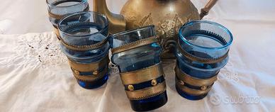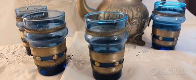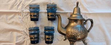 Vendo servizio da tè acquistato in Marocco, composto da 1 teiera ottone cesellato e 4 bicchierini in vetro e ottone a coste con rivetti, di cui uno leggermente filato. No spedizione, si vende l'intero set.