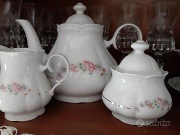 Servizio da te' 12 pezzi (tazze e piattini finemente decorati) + teiera,zuccheriera e lattiera...totali 15 pezzi in fine porcellana. NUOVO, MAI USATO è perfetto come REGALO DA MATRIMONIO. Viene venduto con la scatola e tutto incartato nella sua confezione originale. Vendo a 90 euro in zona Romaest.