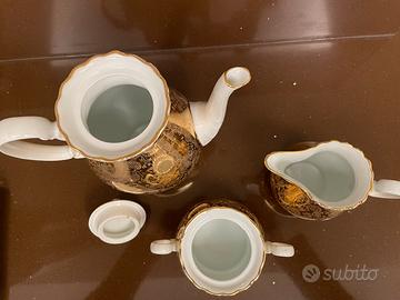 servizio da tè o caffè in porcellana Bavaria, caratterizzato da una raffinata decorazione in oro e un design vintage tipico della produzione tedesca del dopoguerra.