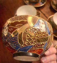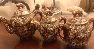 Servizio da tè orientale firmato, composto da 3 teiere e 6 tazze con piattino, nessun difetto, bellissimi i decori dorati con drago sulle teiere.