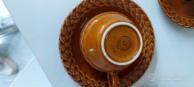 6 tazze con piattino, anni 60, in terracotta smaltata, design trecce. solo una tazza è leggermente scheggiata, come da foto dettaglio.
