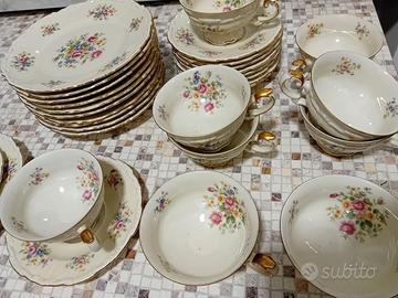 prodotto nella metà del ‘900. Il set è composto da 10 tazze con rispettivi piattini, e 10 piatti da dolce decorati con fiori delicati boccioli di rose con toni molto delicati e profili in oro zecchino.