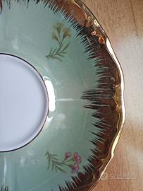 Servizio da tè per 6 persone in porcellana iridescente con oro e decoro floreale. Il servizio si distingue per il fondo madreperlato, iridescente, campiture in oro lucido, delicato decoro floreale multicolore, con bordi mossi e sagomati. Pomelli e beccucci interamente dorati. L'effetto cangiante della porcellana crea riflessi opalescenti che cambiano alla luce, rendendo il servizio estremamente elegante e scenografico. La linea bombata della teiera e della zuccheriera richiama il gusto romantico tedesco di metà Novecento, con una forte impronta decorativa. Un servizio perfetto per tavole importanti, tea party eleganti e collezionismo di porcellana bavarese. COMPOSIZIONE: 6 tazze da te 10,5 cm 6 piattini 15 cm 1 teiera con coperchio 1 zuccheriera con coperchio 1 lattiera DETTAGLI TECNICI Manifattura: RKW Provenienza: Bavaria (Germania) Materiale: porcellana Finitura: iridescente madreperlato Decorazione: floreale con ampie dorature Epoca: seconda metà del Novecento Condizioni: eccellenti.