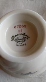 Il set è caratterizzato da una raffinata decorazione floreale policroma con bordino dorato, tipica dell’alta qualità Thomas (gruppo Rosenthal).