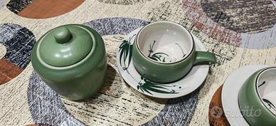 Vendo splendido servizio da tè in stile giapponese vintage, anni ’60/’70, in ceramica verde con elegante effetto craquelé e decorazioni orientali. Composto da: - Teiera - Zuccheriera con coperchio - 2 tazze con piattino Condizioni eccellenti, mai utilizzato, sempre tenuto in vetrina. Oggetto molto decorativo e particolare, ideale per arredamento o collezionisti Contattami subito se interessato!