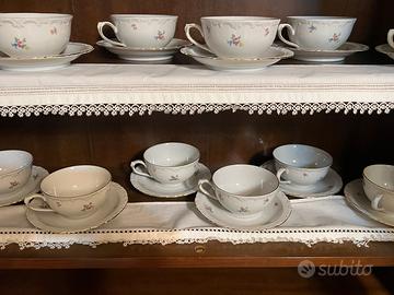 Servizio da 12 tazze da tea e 6 tazzine da caffe con rispettive teiera o caffettiera piu’ lattiera e zuccheriera .
