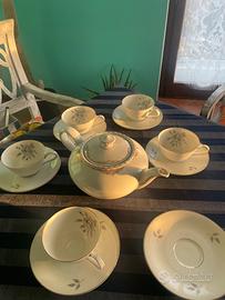 Splendido servizio da te in ceramica, maiolica composto da sei piattini e cinque tazzine decorate finemente con teiera capiente marca Henrich Bavaria