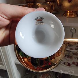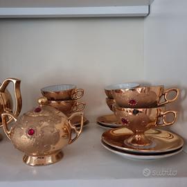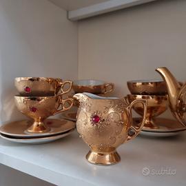 Come da titolo vendo Servizio da caffè/thè antico in porcellana bianca (interno), oro zecchino (copertura esterna), pietre rosse FLORES BAVARIA . Composizione cometa: 12 tazze da caffè/thè, 12 piattini piccoli , 1 teiera (centrale nella foto) con coperchio, 1 zuccheriera e una lattiera. Servizio tenuto perfettamente ed esposto in vetrina. Disponibile per la spedizione.