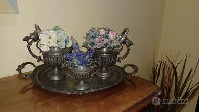 Servizio da the/caffè in peltro con teiera/caffettiera , lattiera e zuccherina + vassoio