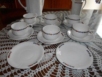6 tazzine, 8 piattini, una teiera, una lattiera.