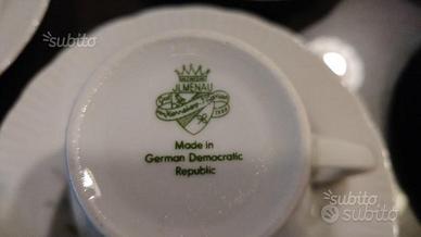 Due servizi completi, uno da The e uno da caffè in finissima porcellana Tedesca JLMENAU. Interamente decorati a mano con motivo floreale celeste e foglioline in oro zecchino.