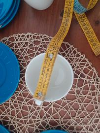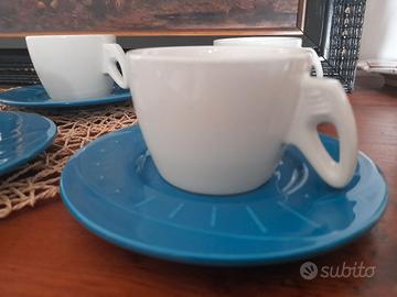Raro e bellissimo servizio da the, design Giugiaro per Pagnossin, per 6 persone, composto da tazzine e rispettivi piattini. Dimensioni come da foto. Colore bianco e blu. C'è anche la loro scatola originale. Il marchio sotto i piattini risulta poco impresso. Decoro stile space age. Una tazza presenta una piccolissima scheggiatura sul fondo esterno, come da immagine. Mai usato.