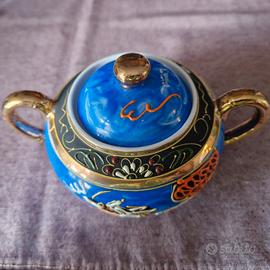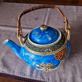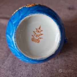 Servizio da the in fine porcellana Giapponese composto da 5 tazze con piattino, teiera con filtro, bricco e zuccheriera con coperchio.