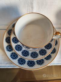 Servizio da thè o caffè in fine porcellana. II servizio è composto da 6 set a sua volta composto da 3 pezzi: una tazza con manico dorato, un piattino per la tazza e un piatto più grande, probabilmente per dolci o sandwich.TOTALE 18 PEZZI.